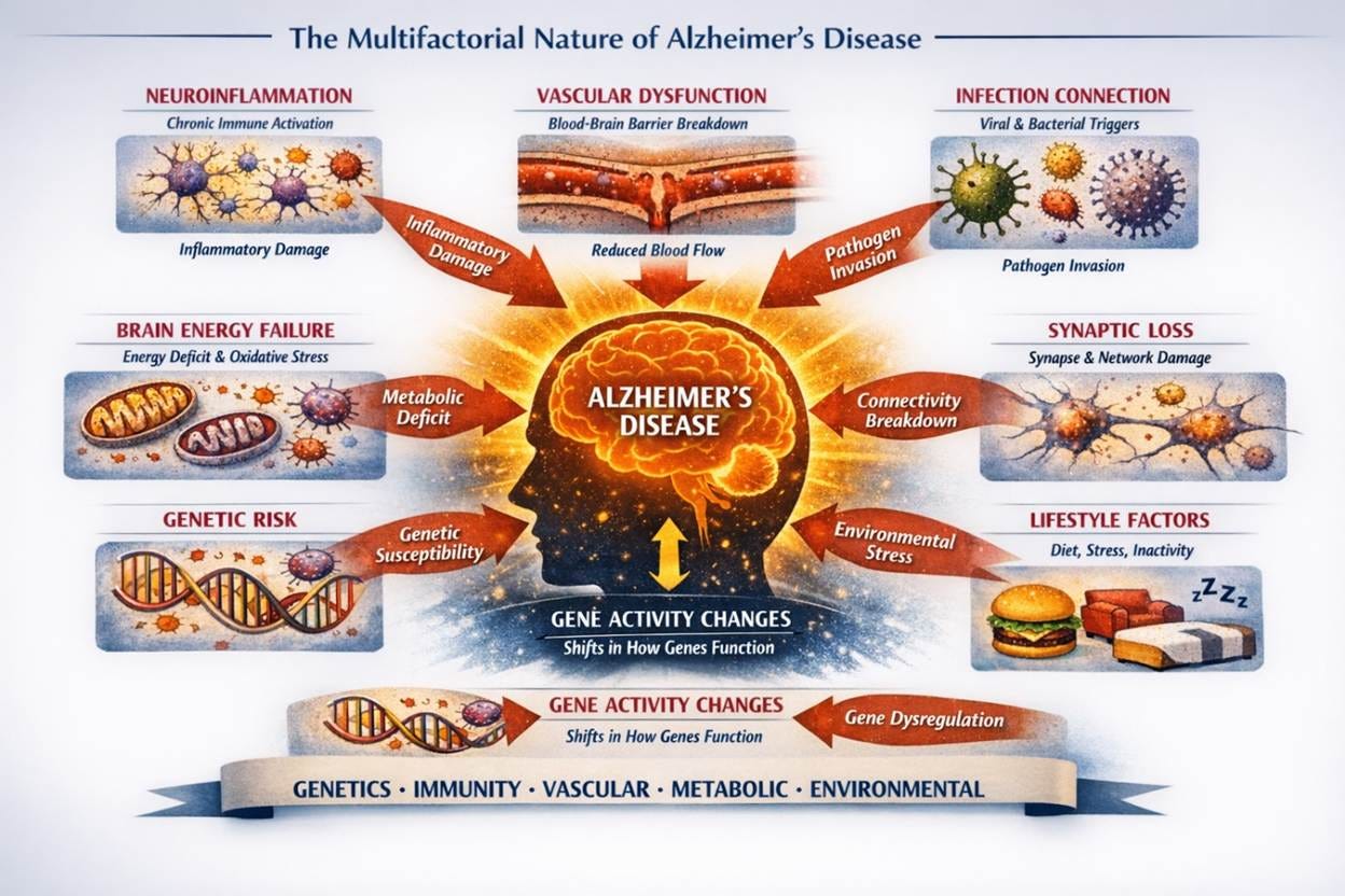 Together, these forces converge into Cognitive Decline and Neurodegeneration, but they also point toward hope of a future where treatment means restoring balance across systems, not chasing a single vector or symptom.